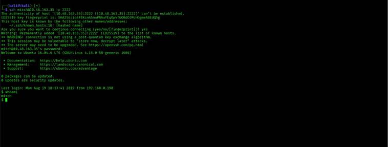 1. SSH in using the cracked credentials: ssh mitch@10.48.165.35 -p 2222